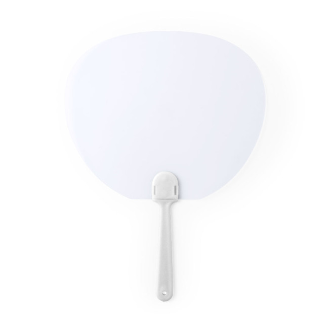 Ventaglio portatile realizzato in rPET, dotato di manico in legno naturale, pensato per offrire...