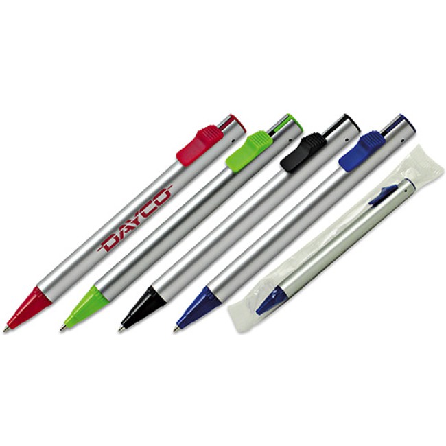 Penna sfera a scatto con fusto in plastica effetto silver e finiture verdi, dotata di refill nero per una scrittura fluida e precisa. Ideale per chi cerca un articolo promozionale economico e d’impatto, adatto a eventi e campagne di marketing aziendale. Perfetta per diffondere il brand in modo elegante e funzionale.