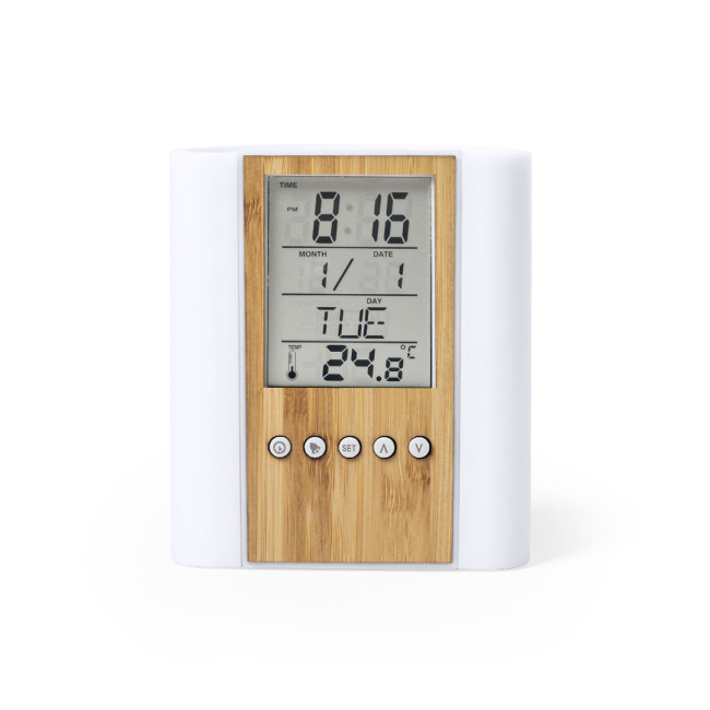 Porta penne multifunctional personalizzabile con orologio digitale e bambù